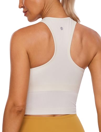 CRZ YOGA Women's Longline Ribbed Crop Tank Top Padded Wireless Racer Back Sports Bra Yoga Vest Tops with Built in Bra White Apricot 12