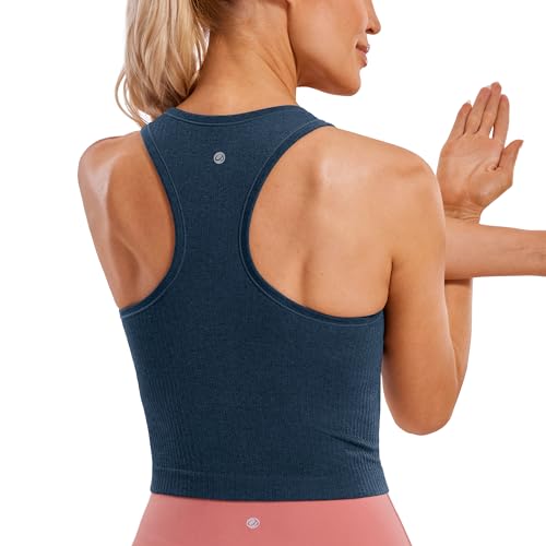 CRZ YOGA Women's Longline Ribbed Crop Tank Top Padded Wireless Racer Back Sports Bra Yoga Vest Tops with Built in Bra French Navy 12