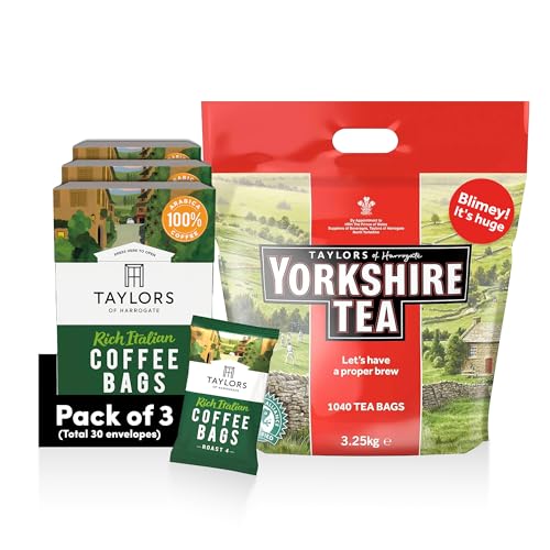 Yorkshire Tea Bundle (Total of 1040 Tea Bags) + Taylors of Harrogate Rich Italian Coffee Bags, 3 Boxes of 10 (Total 30 Bags) – Perfect for the Office