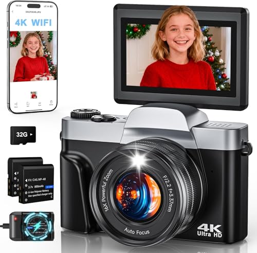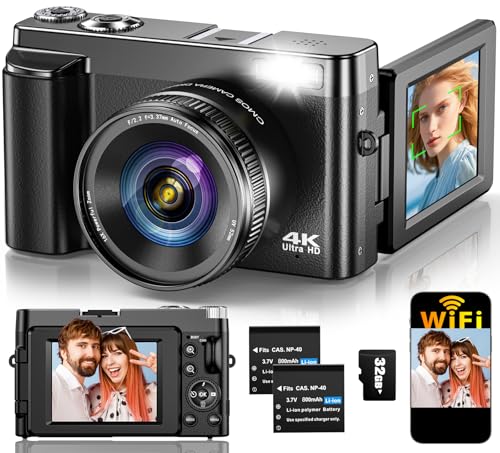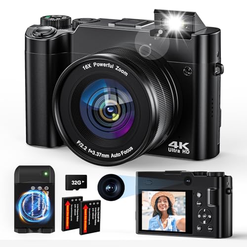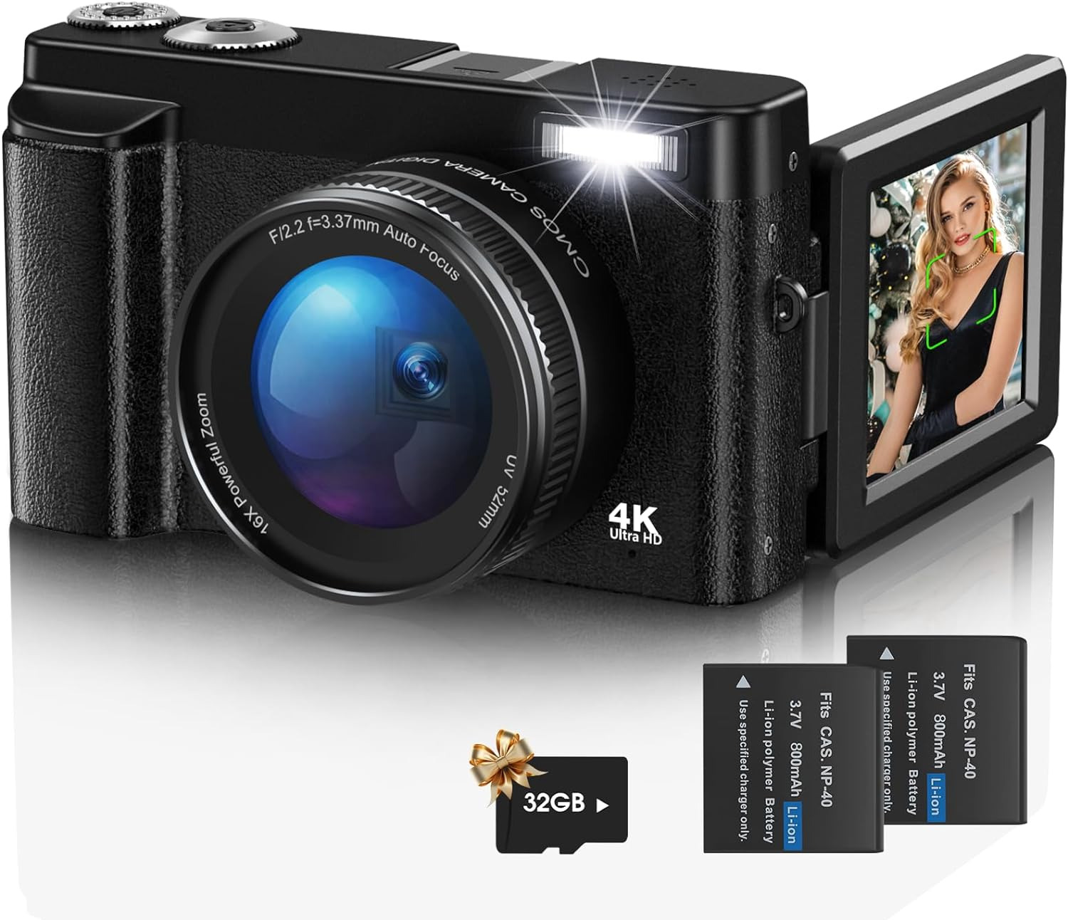4K 64MP Digital Camera with WiFi, 180° Flip Screen, 16X Digital Zoom, Vlogging Camera for YouTube with Flash, Compact Camera with 32GB SD Card, 2 Batteries