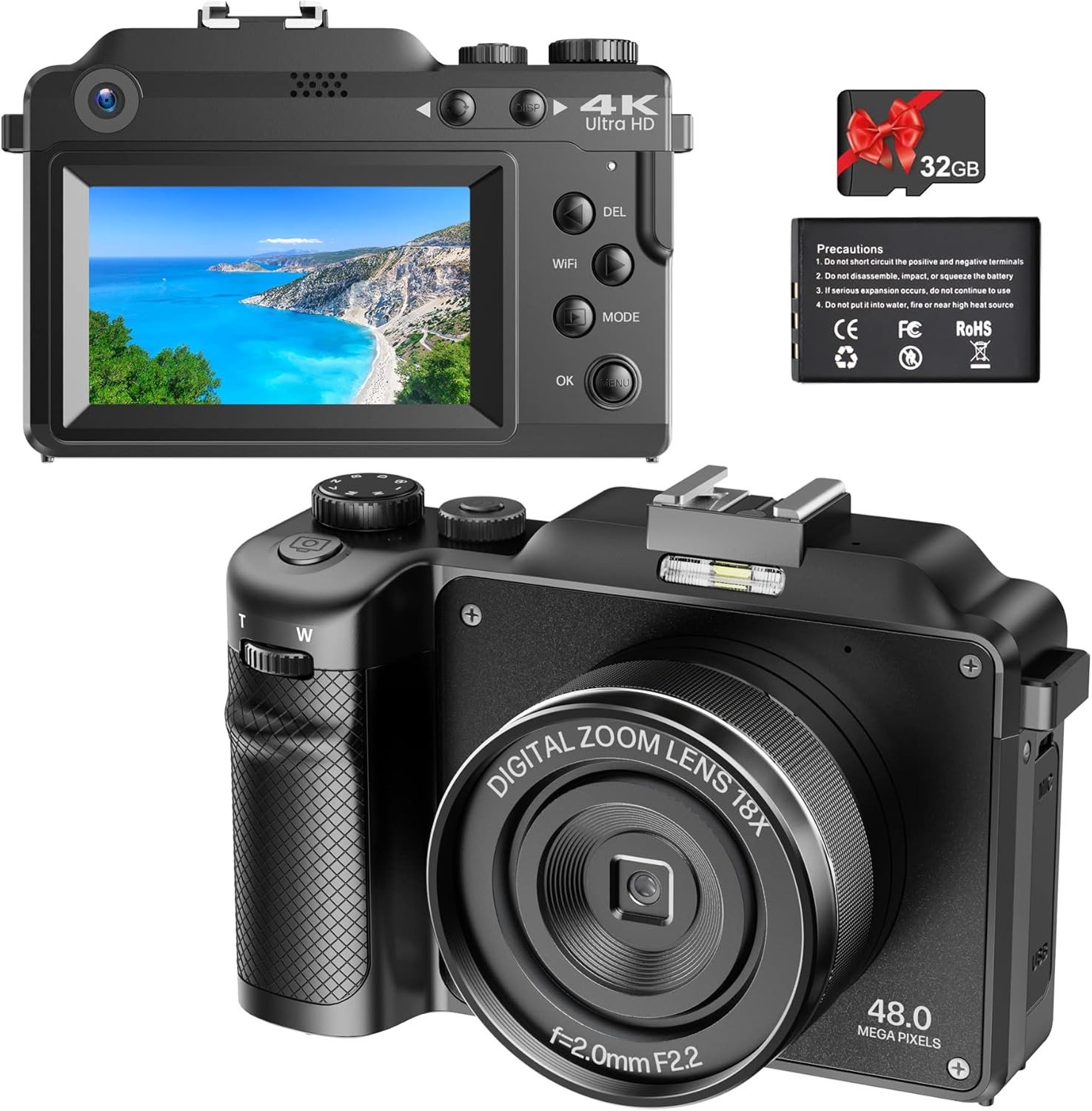 Digital Camera 4K for Photography Vlogging: 48MP Cameras for Video - 16X Zoom Photo Camera Gifts for Teens Ages 8-16 - 180°Flip Screen Compact Cámara - Point and Shoot Digital Cameras for YouTube