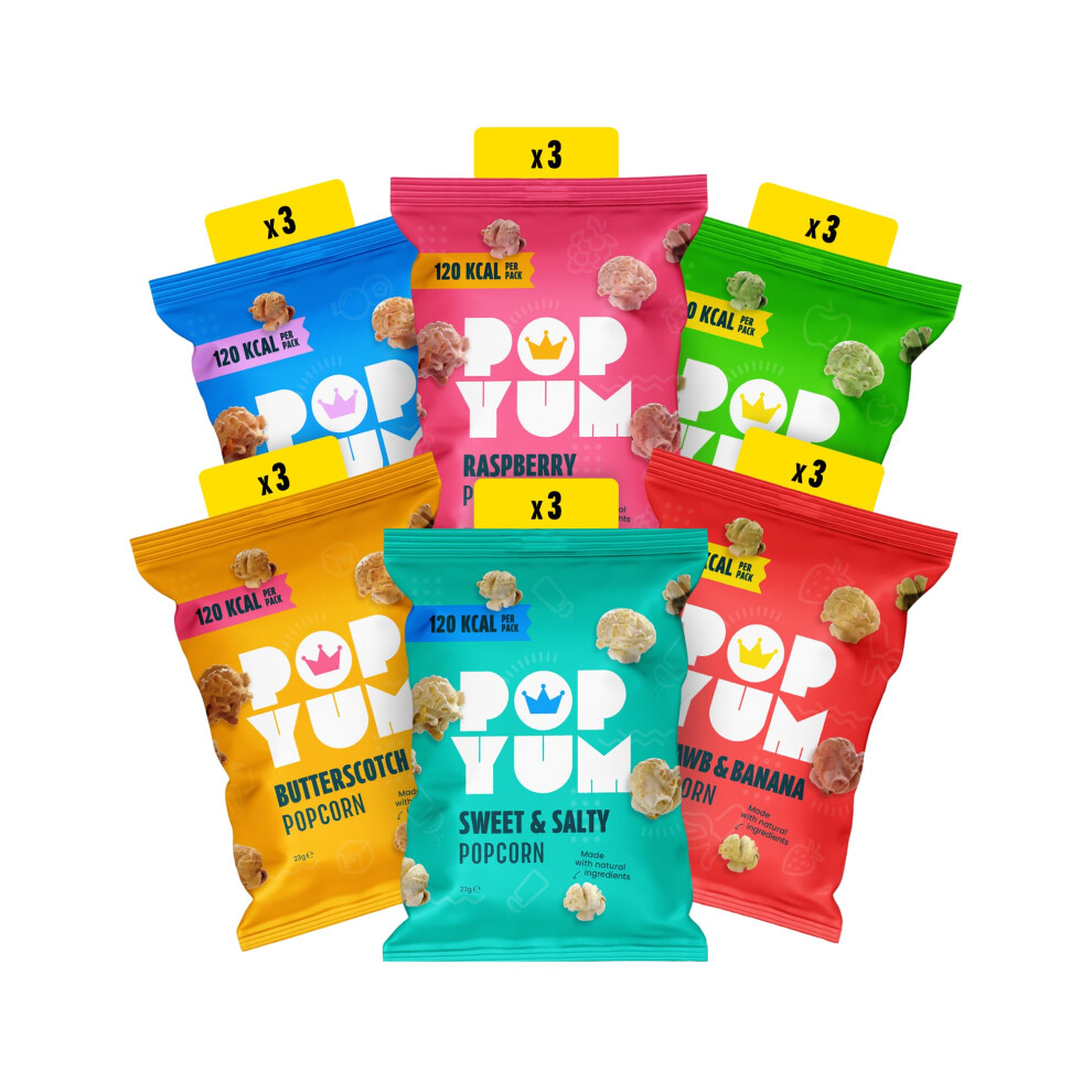 POPYUM Popcorn Variety Box 18-Pack of 23g Bags | Vegan, Gluten-Free Multipack Snacks | Dairy-Free, Low-Calorie Snack Pack | Movie Night Popcorn Box