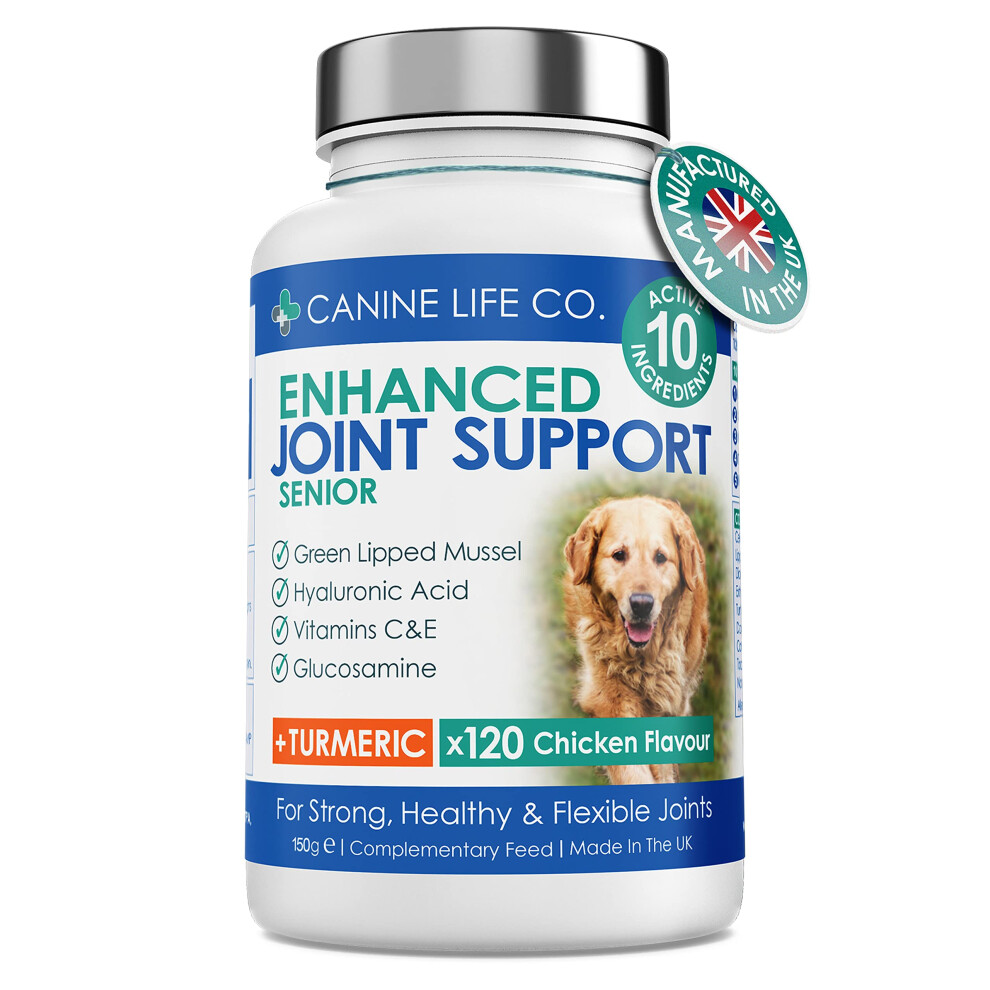 Senior Dog Joint Supplements High Strength With Added Turmeric Glucosamine & Green Lipped Mussel For Older Stiffer Dogs Age 8+ 120 Chewable Tablets Made In The UK From Canine Life Co.