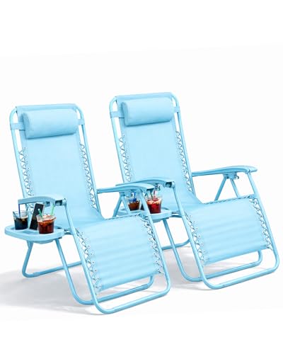 KEPLIN Set of 2 Heavy Duty Zero Gravity Chairs – Padded Garden Recliners with Locking System, 160° Recline, Adjustable Pillow, Removable Tray with Cup & Phone Holders, 250lbs Capacity (Skyblue)
