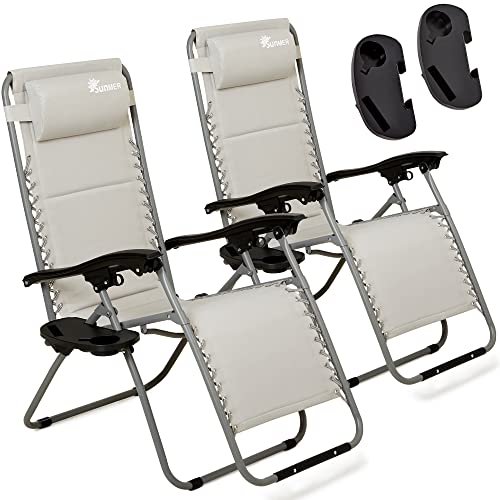 SUNMER Sun Lounger Padded Garden Chairs - Set of 2 Zero Gravity Chairs with Cup & Phone Holder, Adjustable Headrest & Pillow - 30° to 90° Folding Deck Recliner - Professional Outdoor Seating - Grey
