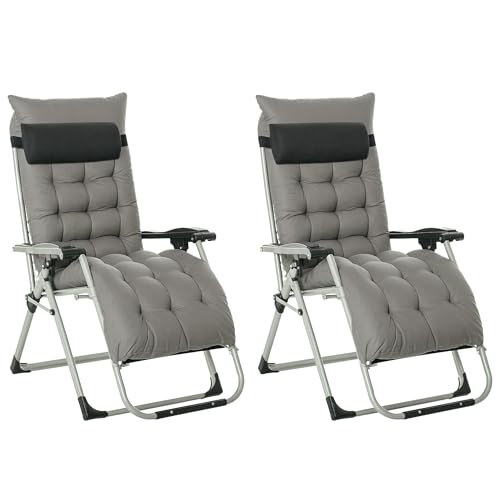 Outsunny 2 Piece Reclining Zero Gravity Chair Metal Frame Folding Garden Sun Lounger with Cushion Headrest, Dark Grey