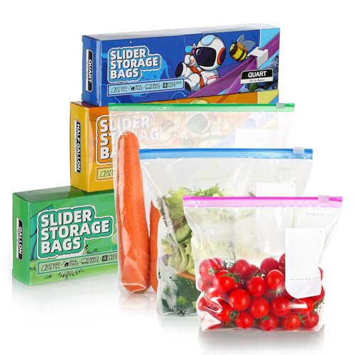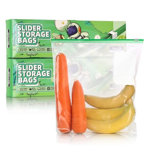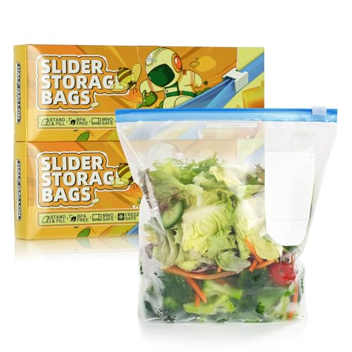 Tuocal 50 Pcs Zip Lock Bags, Freezer Bag (Half Gallon / 2.27L) Reusable Food Storage Bags With Expandable Bottom, BPA Free Slider Ziplock Sandwich Bag for Fruit, Vegetables, Grains, Meat, Snacks