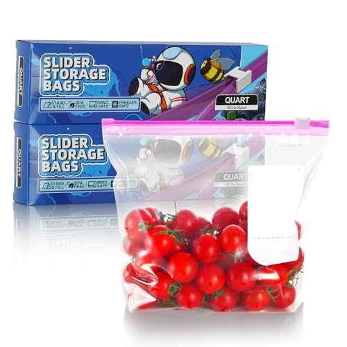 Tuocal 50 Pcs Zip Lock Bags, Freezer Bag (Quart / 1L) Reusable Food Storage Bags With Expandable Bottom, BPA Free Slider Ziplock Sandwich Bag for Fruit, Vegetables, Grains, Meat, Snacks