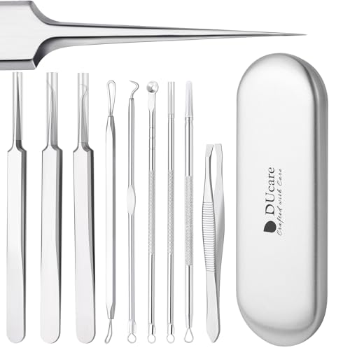 9Pcs Pimple Popper Blackhead Remover Tool by DUcare, Professional Comedone Extractor Kit Hair Eyebrow Tweezers Set for Remove Acne Whitehead Spot Pimple Zit Ingrown