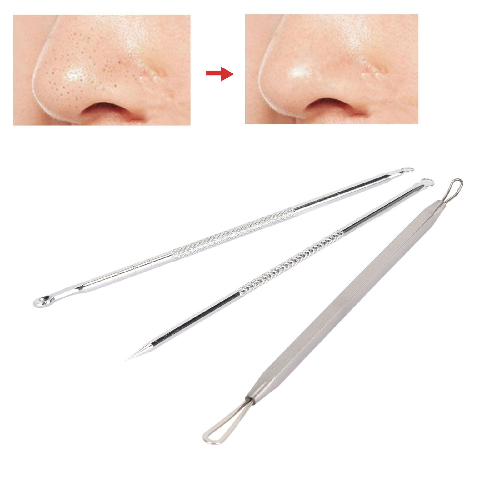 3Pcs Face Nose Zit Pimple Extractor Double Ended Blackhead Whitehead Comedone