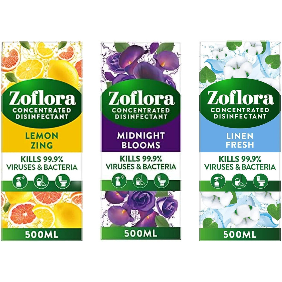 Zoflora Concentrated Multipurpose Disinfectant Bundle - Lemon Zing, Midnight Blooms & Linen Fresh - one of each