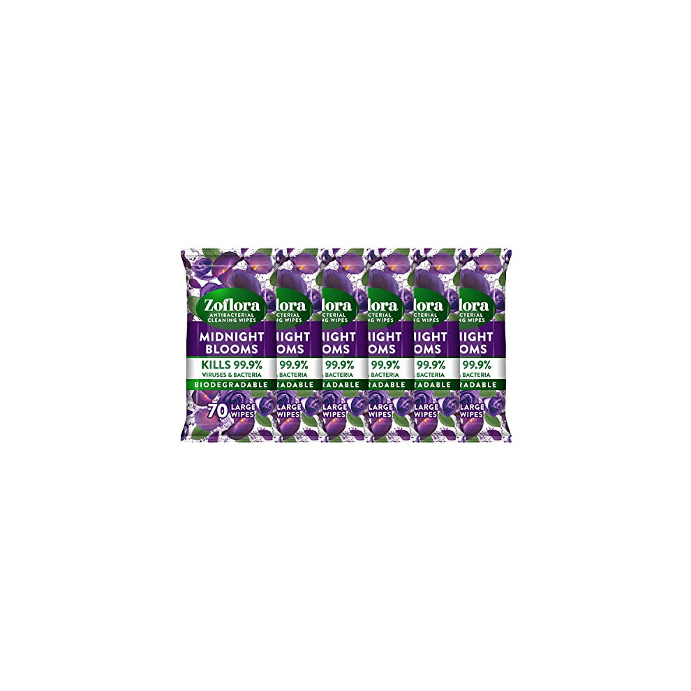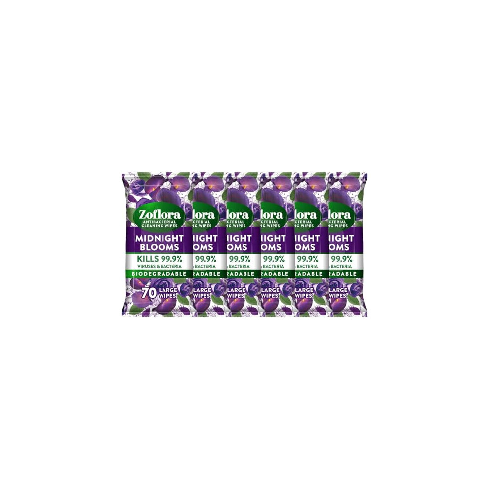 Zoflora Midnight Blooms Large Biodegradeable Wipes, Antibacterial Cleaning, 6 x 70 Wipes Pack, Multi-Surface Disinfectant, Removes Odours & Kills 99.