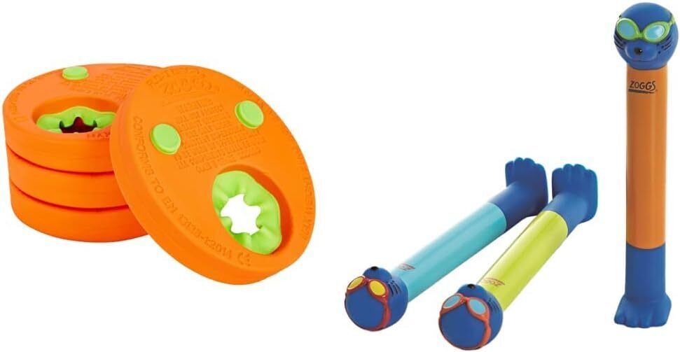 Zoggs Float Discs Armbands, Confidence Building Arm Bands, Safe Zoggs Swimming armbands & Dive Sticks Pool Toys, Confidence Building Diving Sticks, Safe Swimming Pool Toys, Blue/Lime/Orange (3 Pk)