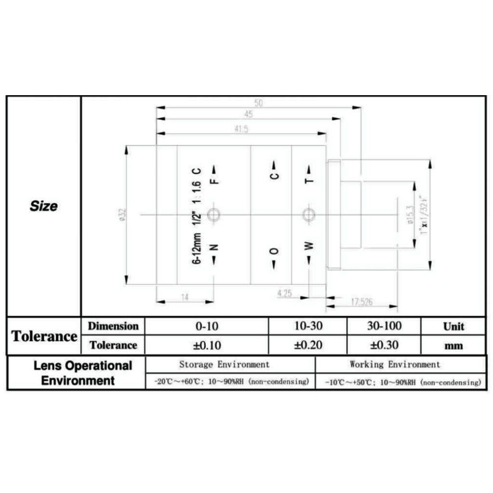 3MP 612mm C-Mount Camera Lens, 6-12mm Zoom, F1.6