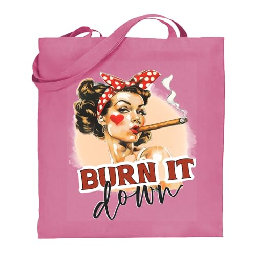 Printshirts Burn It Down Tote Bag – Retro Pin Up Girl Design with Cigar, Funny Sassy Vintage Style Shopper, Reusable Cotton Shoulder Bag for Women (Pink)